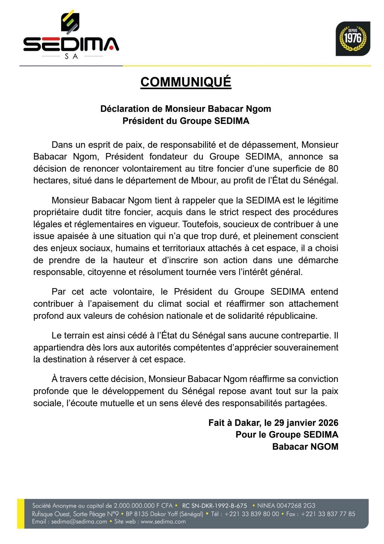 Dakar, 29 janvier 2026 – Le Président fondateur du Groupe SEDIMA, Monsieur Babacar Ngom, a annoncé sa décision de renoncer volontairement au titre foncier portant sur une superficie de 80 hectares située dans le département de Mbour, au profit de l’État du Sénégal.