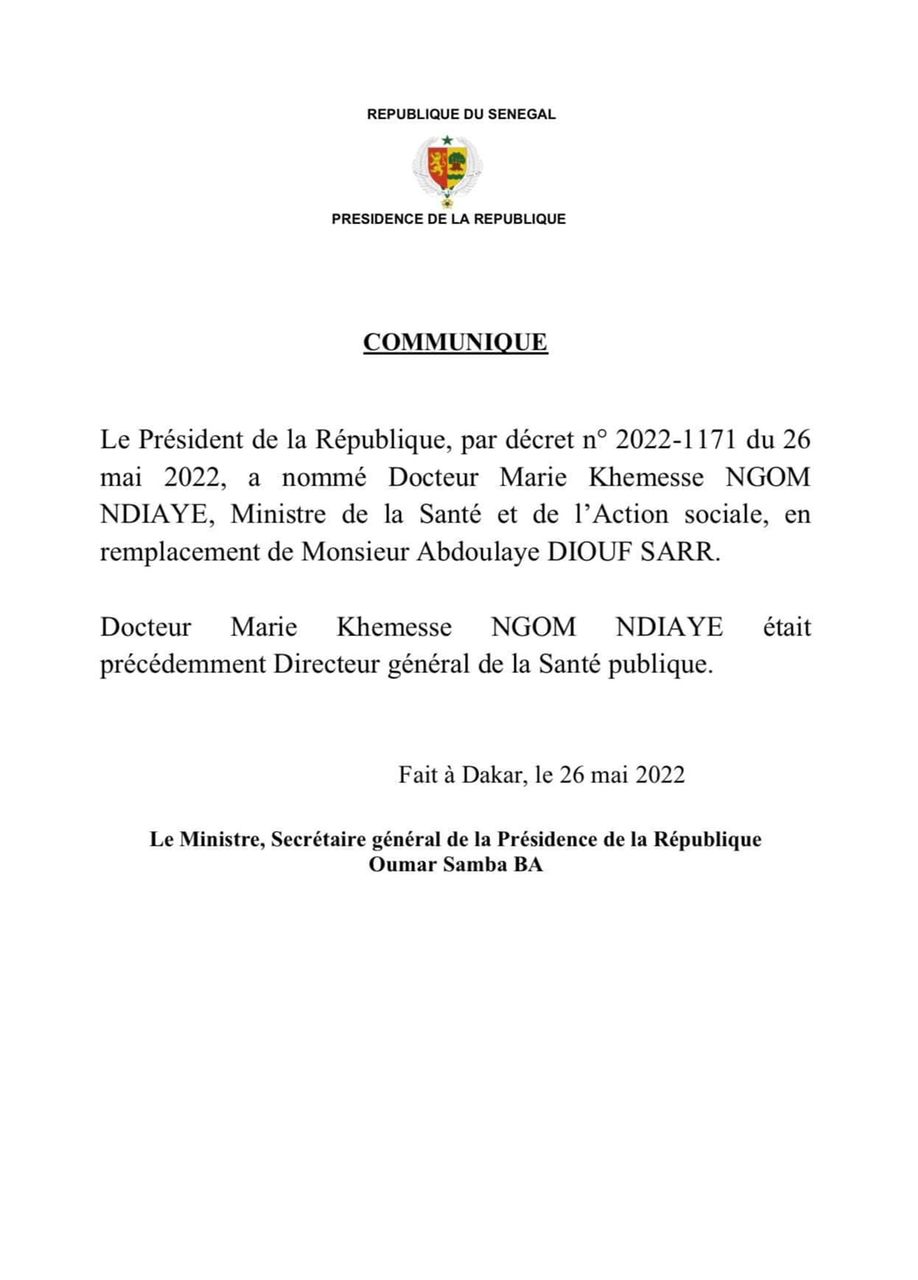 Le Président de la République, par décret n° 2022-1171 du 26 mai 2022, a nommé Docteur Marie Khemesse Ngom Ndiaye, ministre de la Santé et de l’Action sociale, en remplacement d’Abdoulaye Diouf Sarr. Docteur Marie Khemesse Ngom Ndiaye était précédemment directrice générale de la Santé publique.