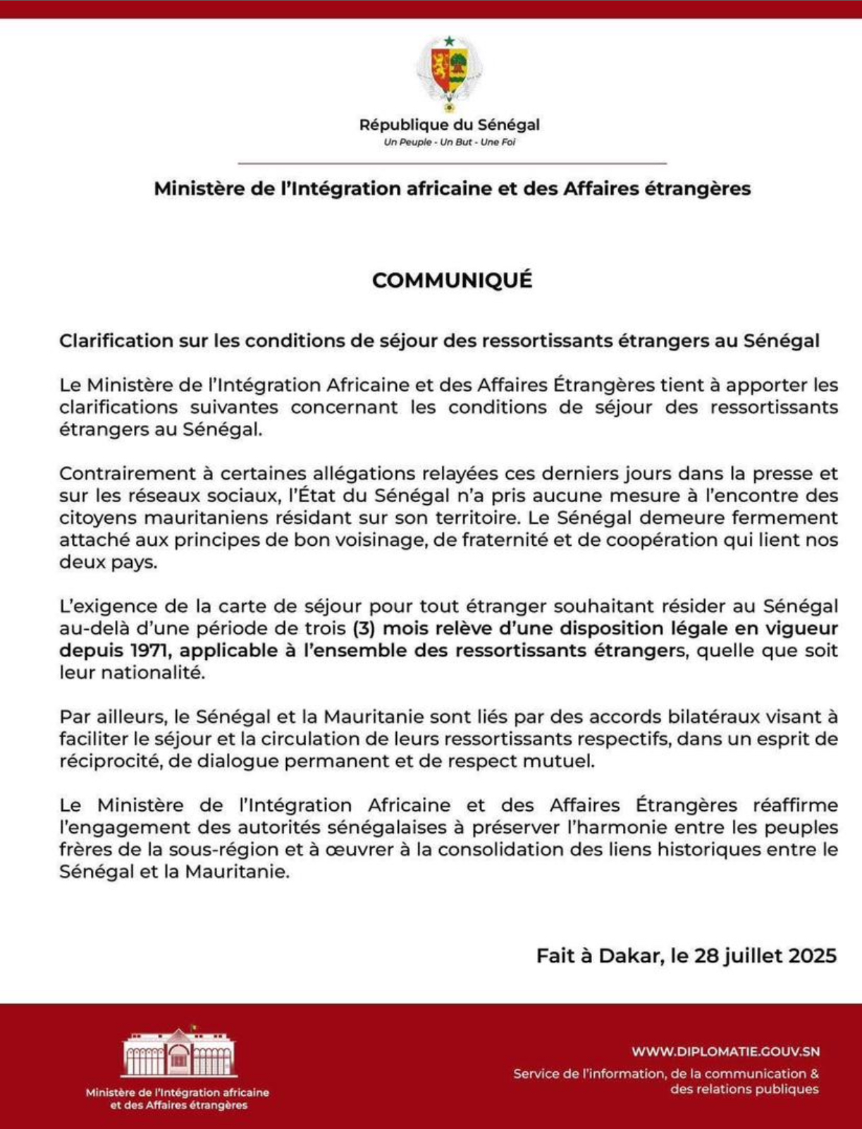 Dakar, 28 juillet 2025 – Face aux rumeurs relayées dans la presse et sur les réseaux sociaux, le Ministère de l’Intégration africaine et des Affaires étrangères a tenu à clarifier les conditions de séjour des étrangers vivant au Sénégal.